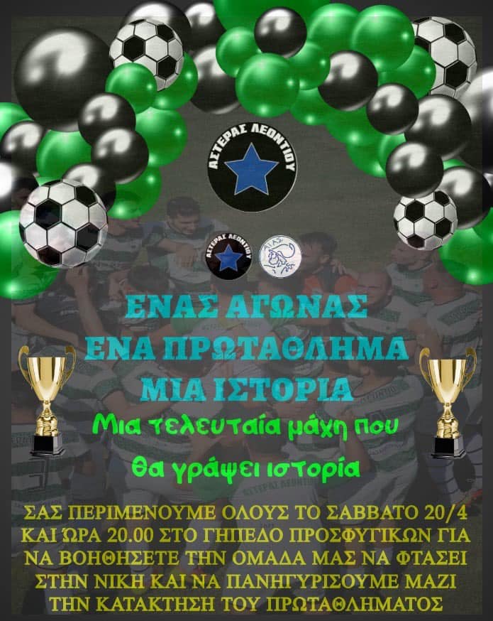 Το Σάββατο (20/4) στις 20:00 στο γήπεδο των Προσφυγικών η ομάδα του Λεοντίου θα αντιμετωπίσει τον Αίαντα για την τελευταία αγωνιστική του β’ ομίλου της Β’ Κατηγορίας.