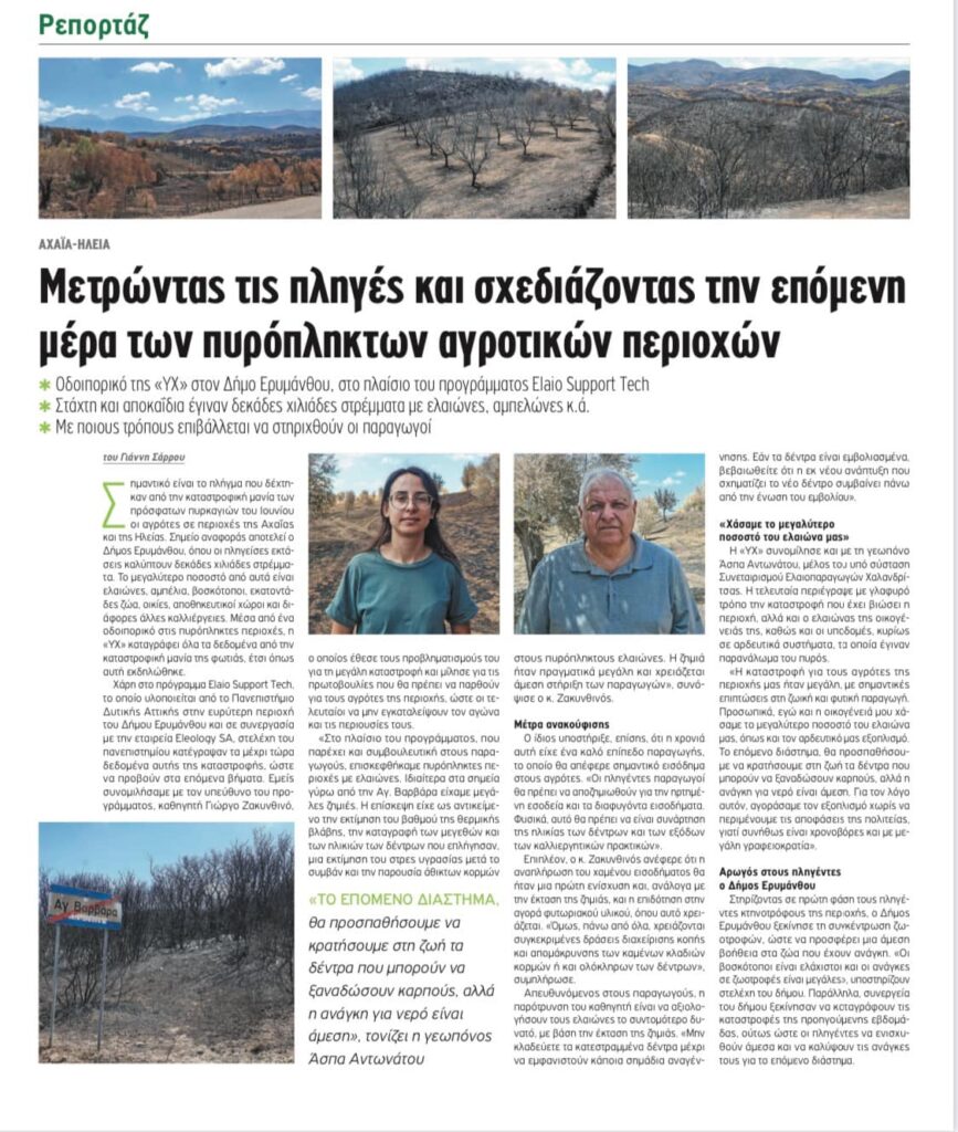 Μέσω του προγράμματος Elaio Support Tech, οι ειδικοί συμβουλεύουν τους παραγωγούς για την ανασυγκρότηση των καλλιεργειών τους και την αποκατάσταση των ζημιών που έχουν υποστεί. Οι συζητήσεις αφορούν επίσης την αναγκαιότητα σωστής διαχείρισης των καμένων εκτάσεων.