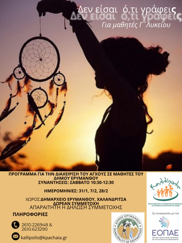 Μια σημαντική πρωτοβουλία στήριξης των μαθητών που προετοιμάζονται για τις Πανελλήνιες Εξετάσεις υλοποιεί ο Δήμος Ερυμάνθου σε συνεργασία με το Κέντρο Πρόληψης των Εξαρτήσεων και Προαγωγής της Ψυχοκοινωνικής Υγείας Π.Ε. Αχαΐας «Καλλίπολις», το οποίο λειτουργεί σε συνεργασία με τον Εθνικό Οργανισμό Πρόληψης και Αντιμετώπισης Εξαρτήσεων (Ε.Ο.Π.Α.Ε.) και με την υποστήριξη των σχολείων της περιοχής.